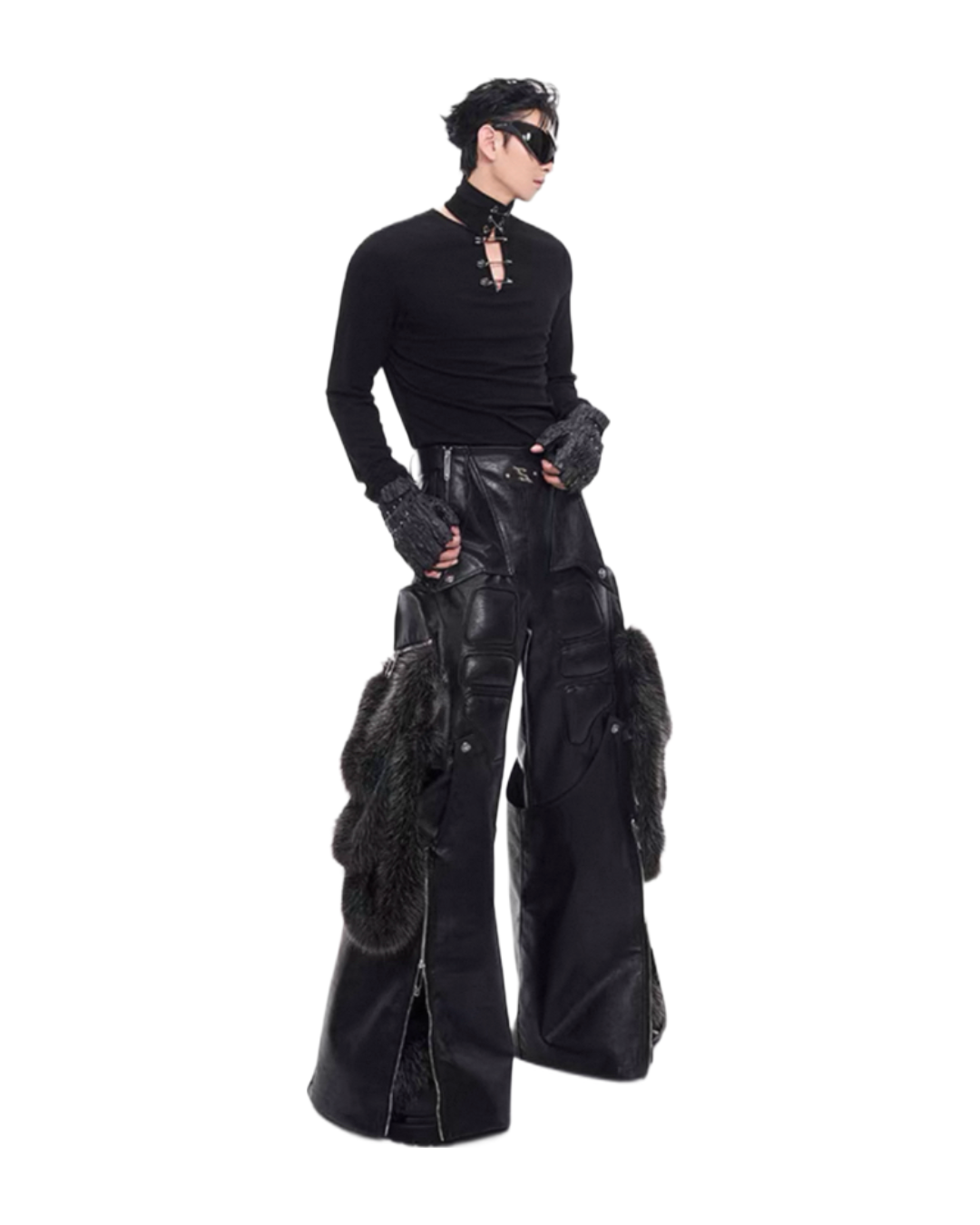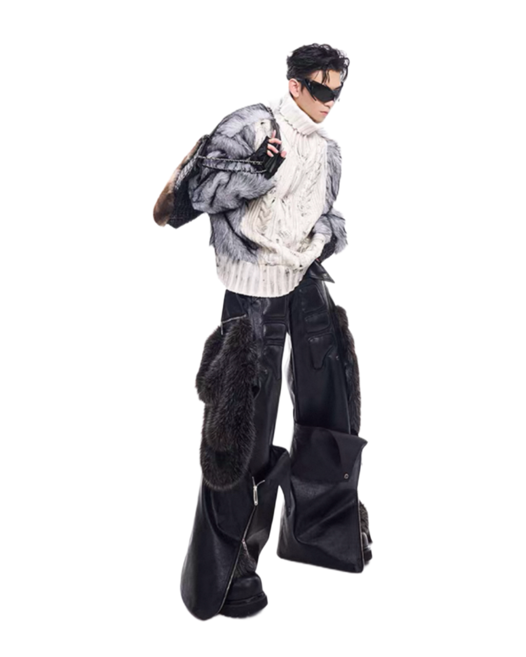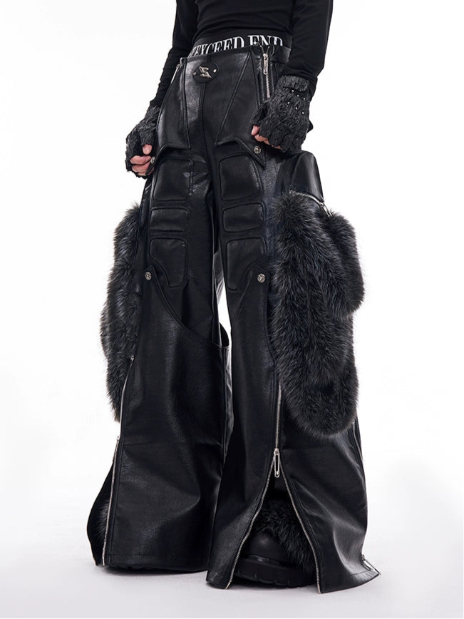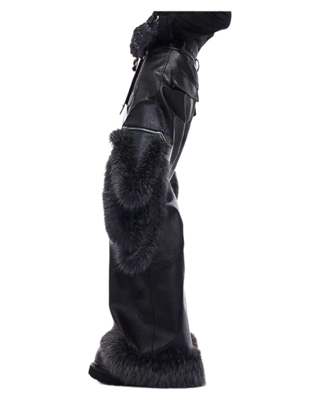 STARTEXCEEDEND Splicing Leather Fur Cargo Pants